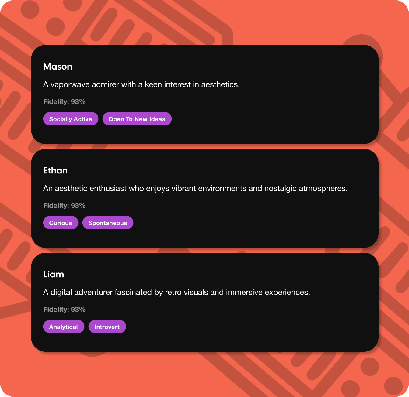 Soulmates.ai does not rent audiences. We build them from the ground up, the hard way. Everything starts with real people deeply aligned with your brand and category. No third-party panels. No syndicated data. Just high-fidelity, bespoke audiences built to reflect the traits that matter most: motivations, mindsets, and emotional drivers. Modeled with a 93% fidelity score that is unmatched in the market.